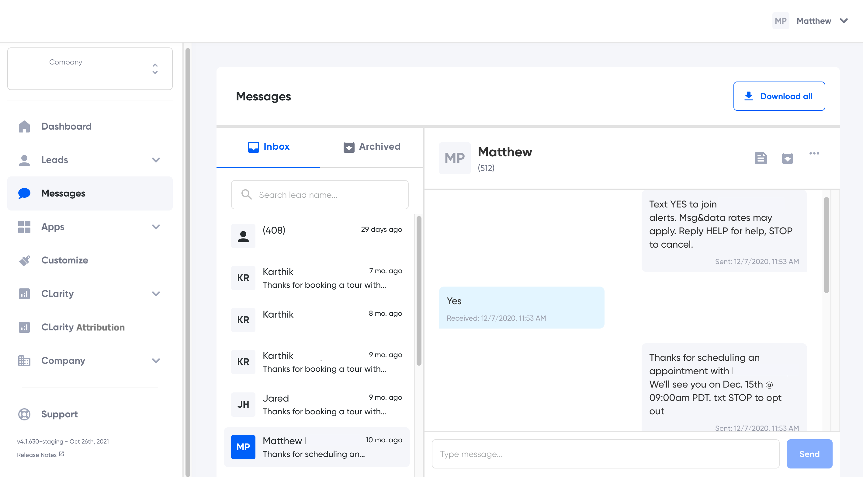- Download All button: Exports all messages, the time and date the message was sent or received, the message status (sent/not sent), the from and to phone numbers, the customer's full name, and the message and thread ID.