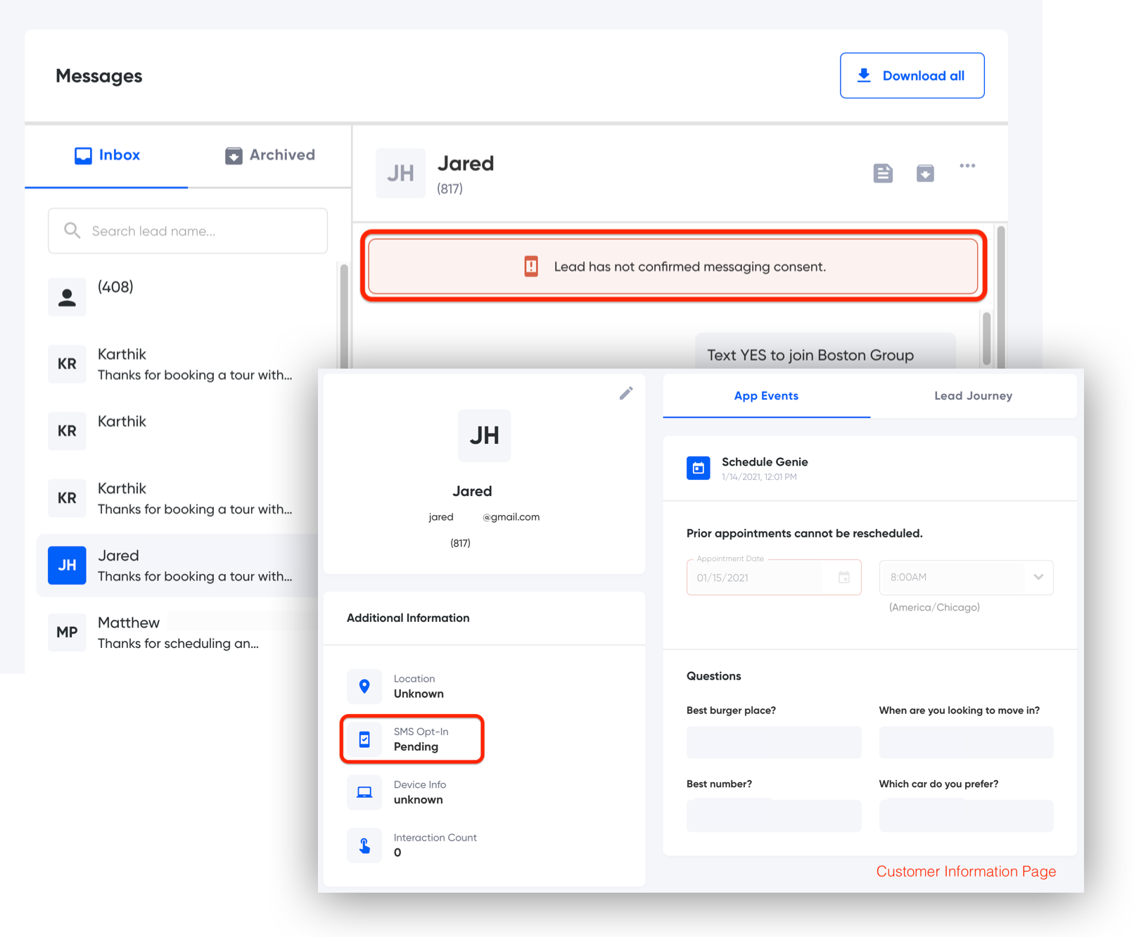 - The customer must agree to receive SMS text messages from the company by clicking the opt-in checkbox within the app form. This step is to identify the customer's consent in the Lead Details Page and Messages thread as "Pending." A message can not be sent to a customer in this state.